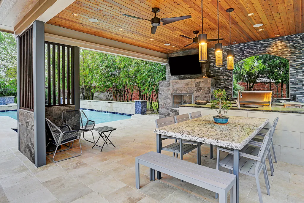 For the best of both worlds, consider investing in a covered stone patio and outdoor kitchen combo. This option allows you to enjoy the benefits of both features while creating an inviting atmosphere for everyone. The covered stone patio protects from the elements while still letting in natural light to your backyard oasis.